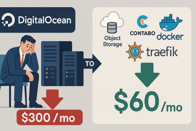 Mon client payait 300 $ par mois pour trois serveurs sur-provisionnés chez DigitalOcean. Découvrez comment une refonte stratégique de l'architecture, passant par le Stockage Objet, Contabo, Docker et Traefik, a permis de diviser cette facture par cinq, sans perdre en performance.